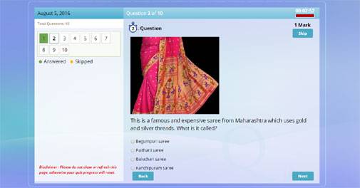 The quiz is timed and has 10 questions to be answered in 3 minutes. The question asked are related to the Indian textiles industry. The questions are randomly picked from a question bank. Once you complete the quiz, you will be awarded a certificate based on the points you earn.