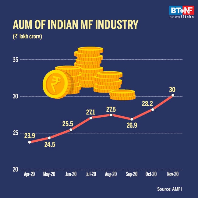Assets Under Management (AUMs) of the Indian mutual fund industry increased by 10.7 per cent YoY in November 2020. On a month-on-month basis it rose 6.4 per cent to Rs 30 lakh crore.
