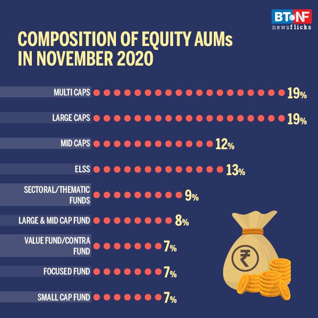 Equity schemes saw continuous net outflow for fifth consecutive month at Rs 12,917 crore in November 2020. Out of net assets of Rs 8.9 lakh crore in equity MFs, the largest share continues to be of large cap and multi cap funds at 19 per cent each, followed by ELSS with 13 per cent.