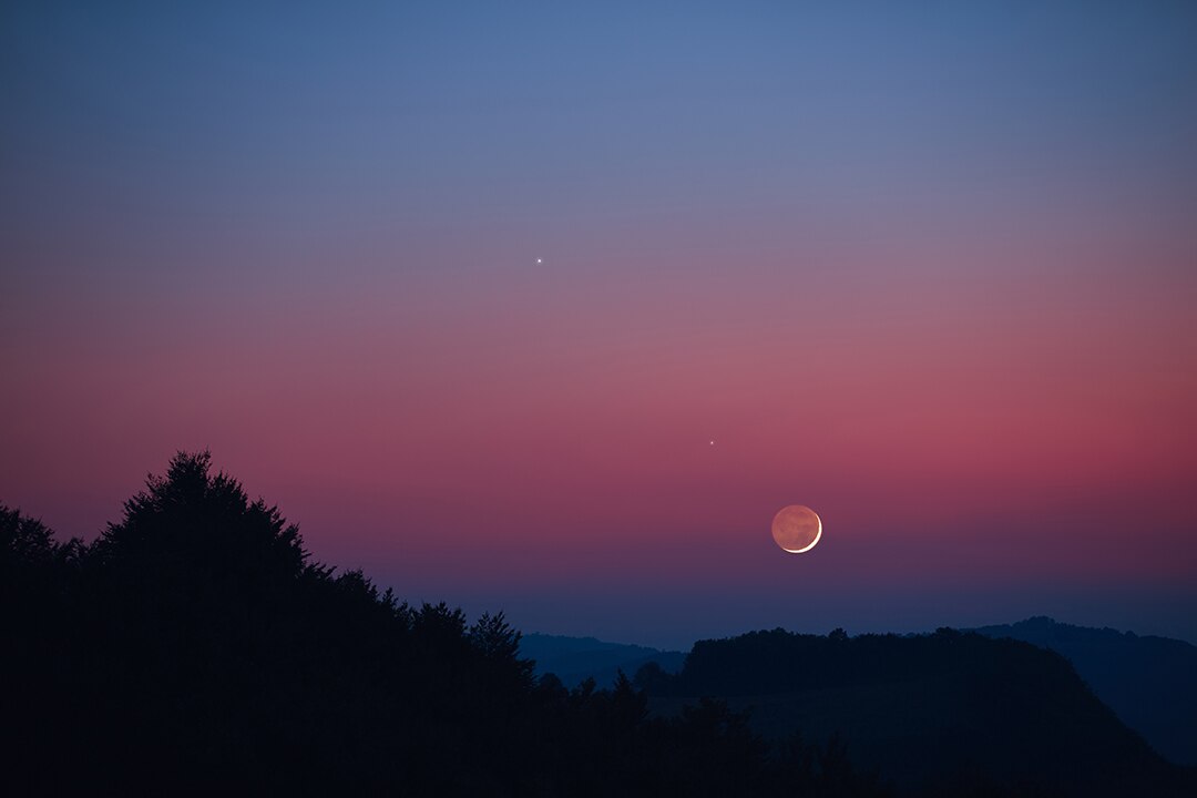 Watch as Mars glows like a fiery ember beside the Moon’s cool crescent—an elegant pairing of cosmic opposites lighting up the dusk.