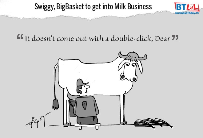 Swiggy, Bigbasket get into milk business!!! Cartoon by @chandancartoons
