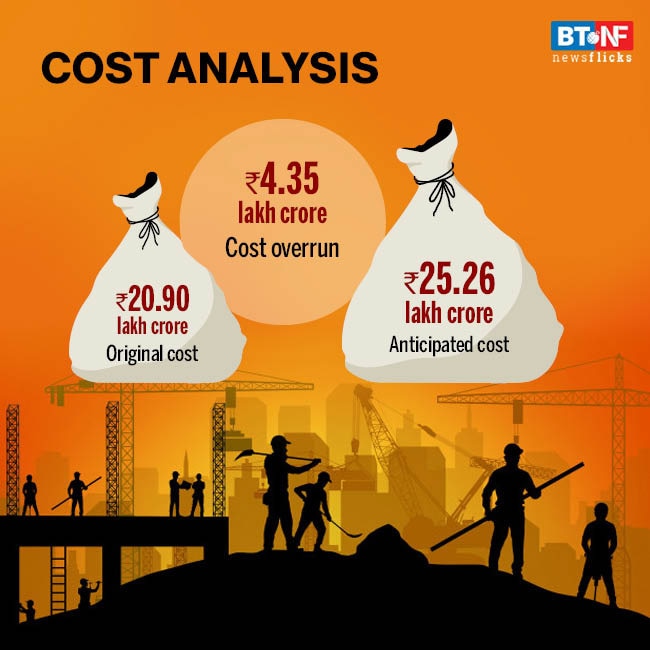 As on September 1, total original cost of implementation of the 1,661 infrastructure projects (worth Rs 150 crore and above) was Rs 20.90 lakh crore and their anticipated completion cost is likely to be Rs 25.26 lakh crore, which reflects overall cost overruns of Rs 4.35 lakh crore.