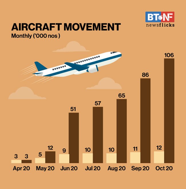 Domestic flight movements saw a monthly increase of 24% to 1,06,450 flights in October and a further narrowing of the year-on-year decline to 45%. Domestic flight movements have progressively increased with the government increasing permissible capacity that airlines can operate from 33% in May'20 to 60% in September'20. This was further increased to 70% on 11 November'20. International flight movements have been limited given the prevailing restrictions on their operations.