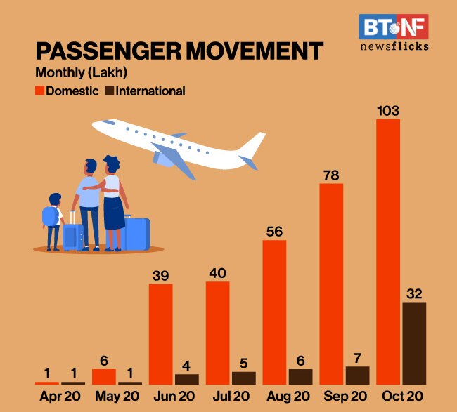 Improved monthly passenger traffic has led to improved capacity utilisation or passenger load factor (PLF) of airlines. The PLF of the major domestic airlines averaged 66% in October. The PLF of major airlines was significantly lower than the pre-pandemic (February'20) levels of average 88%.
