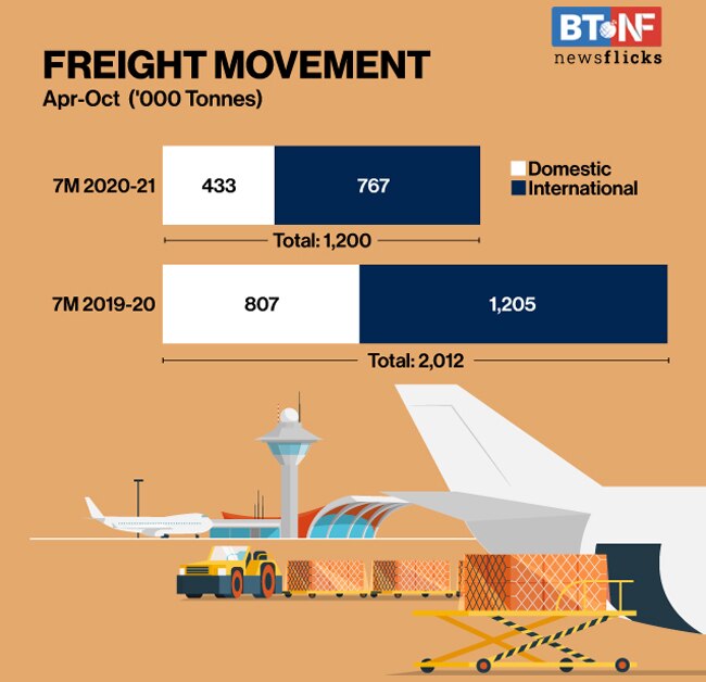 The decline in freight traffic during the seven months to October'20 has been sharper in the case of domestic cargo at 46% as against the 36% fall in the case of international cargo. Despite lower number of international flights, share of international freight has been higher as suspension of international passenger flights does not extend to cargo flights.