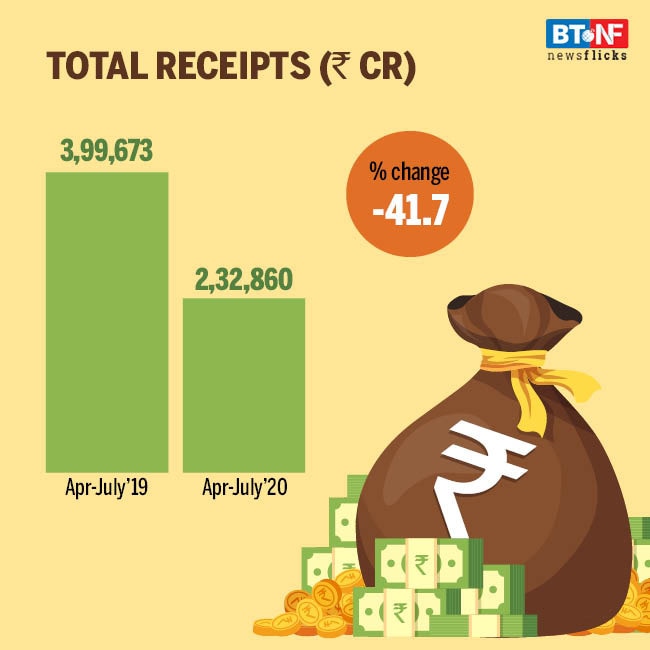 Total receipts of the government have fallen by 41.7 per cent during April-July 2020 compared with the corresponding period last year. The receipts from disinvestments so far have been only Rs 2.9 crore compared with a target of Rs 2.1 lakh crore for 2020-21.