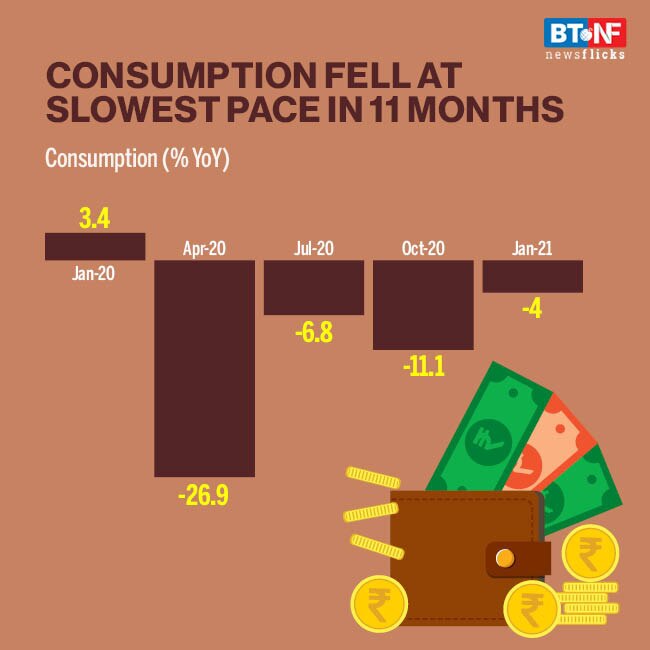 A slower decline in EAI-GDP was on account of the slowest decline in consumption in 11 months. Total consumption (personal and government) contracted 4% YoY in January 2021, against 4.4% Y-o-Y in December 2020 and 3.4% Y-o-Y growth in January 2020.
