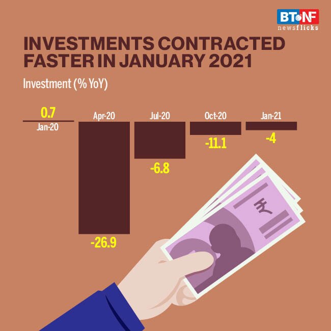 Investments declined faster in January 2021, after posting the slowest decline in 10 months in December 2020. Investments, however, declined much faster at 4.7% YoY in January 2021 as compared to -1.6% YoY in December 2020.
