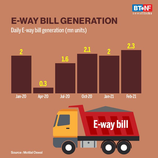 In a sign of sustained growth momentum, e-way bill generation was at the highest-ever level of 2.3m units in February 2021.SHIVANI SHARMA, PRAGATI SRIVASTAVA