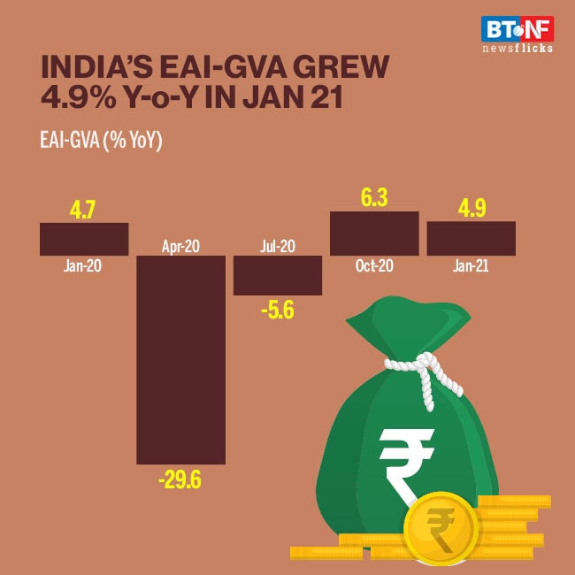 Economic Activity Index (EAI) for India's real gross value-added (GVA; called EAI-GVA) posted faster growth of 4.9% Y-o-Y in January 2021 as compared to 4.7% in January 2020.