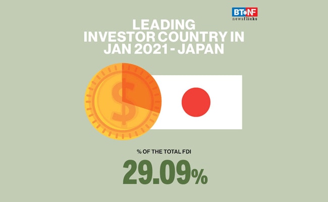 Japan has been leading the list of investor countries to invest in India with 29.09% of the total FDI Equity inflows during January 2021, followed by Singapore (25.46%) and the US. (12.06%).