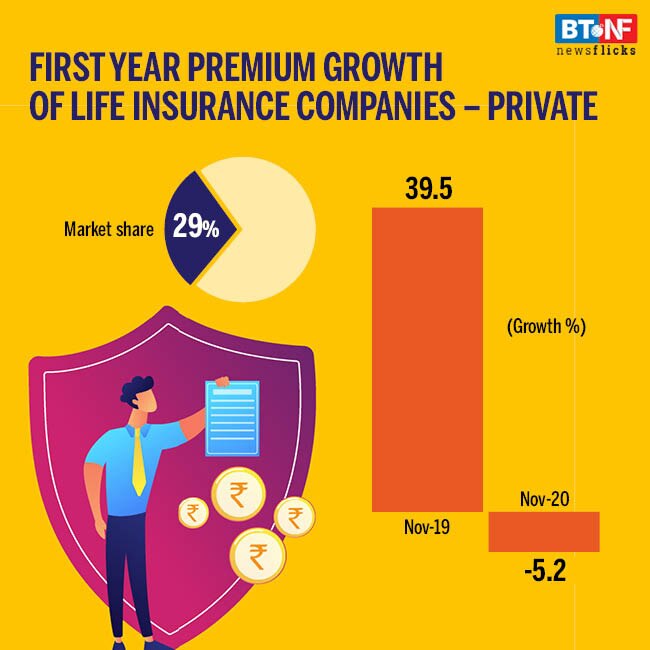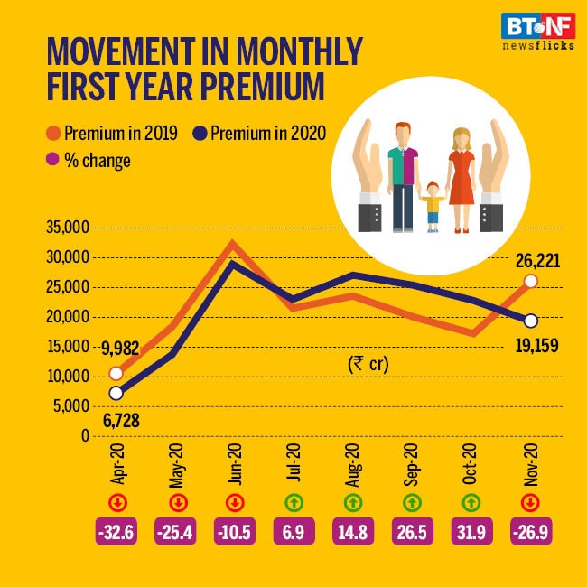 Life insurance sector reported a drop in First Year Premium during November after witnessing a growth for four continuous months in FY21. First Year Premium of life insurers fell by 26.9% in the month of November 2020 to Rs 19,159 crore, compared to Rs 26,221 crore in November 2019.