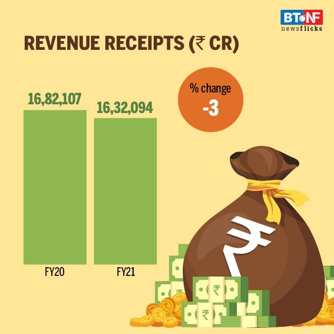Total revenue receipts of the government during the fiscal is estimated at Rs 16.3 lakh crore, 3 per cent lower than the previous year but almost 5 per cent higher than the revised estimate of FY21.