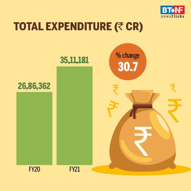 Total expenditure of the central government is estimated at Rs 35.1 lakh crore, 1.8 per cent more than the revised estimate of FY21 and almost 30.7 per cent more than the previous year.
