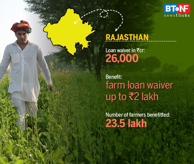 Rajasthan new chief minister Ashok Gehlot, decided to completely write off loans taken from cooperative banks, while for nationalised and other banks the waiver would be for loans up to Rs 2 lakh as on November 30, 2018. The move will cost the exchequer Rs 26,000 crore, including Rs 8,000 crore sanctioned by the previous CM Vasundhara Raje and will benefit farmers who are in trouble and have defaulted in loan payment. The scheme is likely to benefit 23.5 lakh farmers in the state who have taken farm loan from cooperative banks.