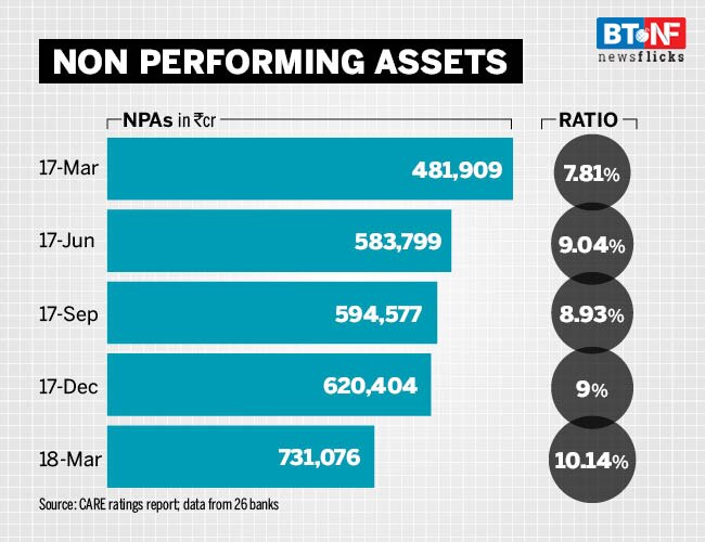 According to a CARE Ratings report, the situation of NPAs in Indian banking sector is alarming. In March 2018, the NPAs of 26 banks were Rs 7.31 lakh crore and have increased by Rs 2.5 lakh crore this year over March 2017.