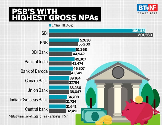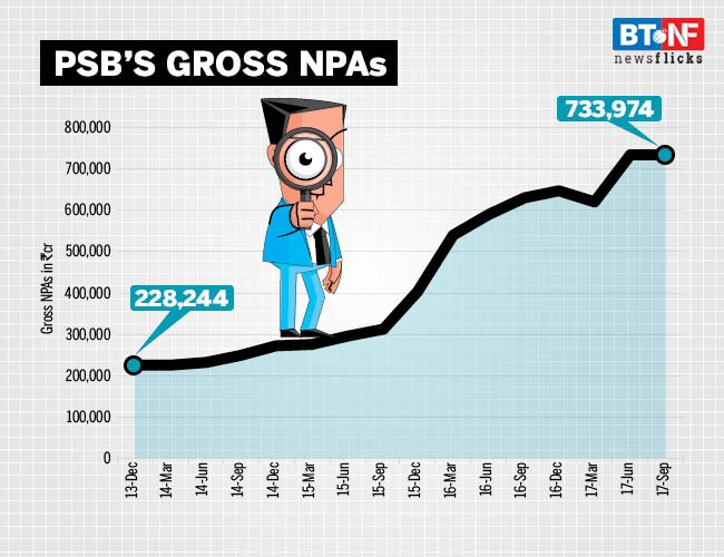 This graph specifically focuses on the public sector banks (PSB) where the gross NPA is touching the value of Rs 7,33,974 crore. The rise can be attributed to the RBI's February guideline which mandated the banks to report the NPAs which had surpassed the 90-day period. The major PSBs include SBI, PNB, IDBI, Bank of India among others.