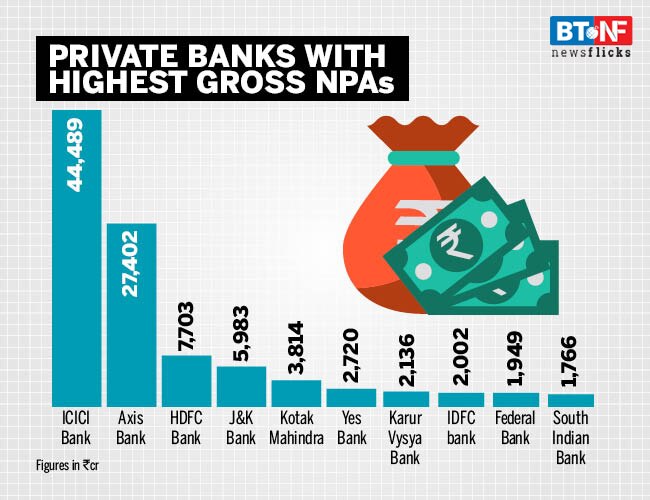 ICICI Bank had the highest amount of NPAs in the private sector bank category of Rs 44,489 crores. AXIS Bank, Federal Bank and South Indian Bank had NPAs less than Rs 2,000 crore.
