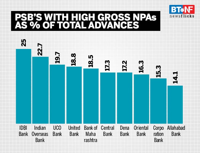 When we compare the NPA with respect to the total advances made by a bank, the IDBI Bank was the worst lender as it had the heighest rate of default. About 25% of its advances was converted into NPAs. Most of the PSUs lie in the same crater when it comes to bad loans.