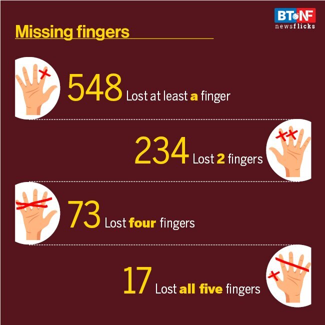 548 people have lost at least a finger, 234 have lost two, 133 have lost three, 73 have lost four and 17 have lost all five.