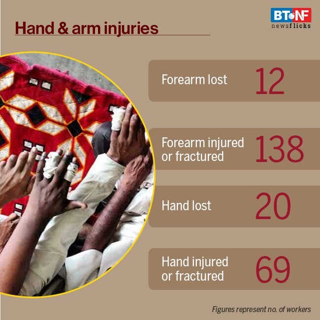 According to the report by Safe India foundation, 12 out of 150 workers have lost their arm, while the rest have either injured or fractured their arm. Out of 89 workers 20 have lost a hand, while the rest have fractured or injured a hand.