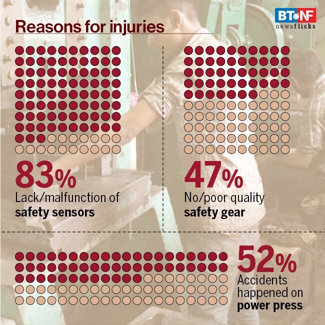 Bulk of the injuries - 83 per cent happened because the machines either did not have safety sensors or they were malfunctioning. About 47 per cent of the workers lacked or had poor-quality safety gear and 52 per cent of the accidents happened in only one type of machine -- the power press.