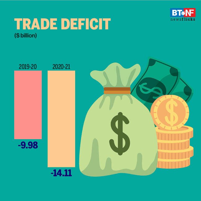 India is a net importer in March 2021 with a trade deficit of $14.11 billion as compared to trade deficit of $9.98 billion in March 2020, increased by 41.4 per cent.