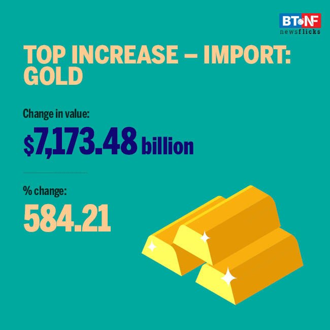 Major commodity that showed positive growth in imports during March 2021 over the corresponding month of last year was Gold with highest increase of 584.21 per cent.