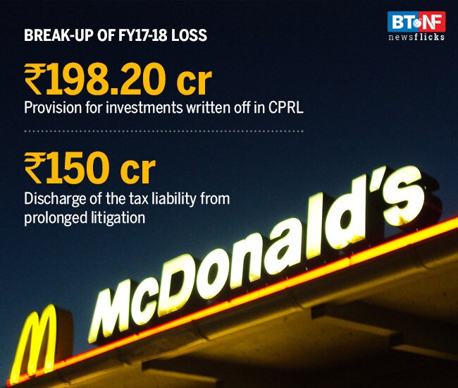 As per the official filing, the loss is due to provision amounting to Rs 198.20 crore created to write off investments in CPRL (Connaught Plaza Restaurants), a 50:50 joint venture between Vikram Bakshi-led CPRL and Mc Donald's India. Loss is also on account of one-time provisions of nearly Rs 105 crore made for the discharge of the tax liability arising from the prolonged litigation with the Indian taxation authorities as well as the Mutual Agreement Procedure (MAP) proceedings.
