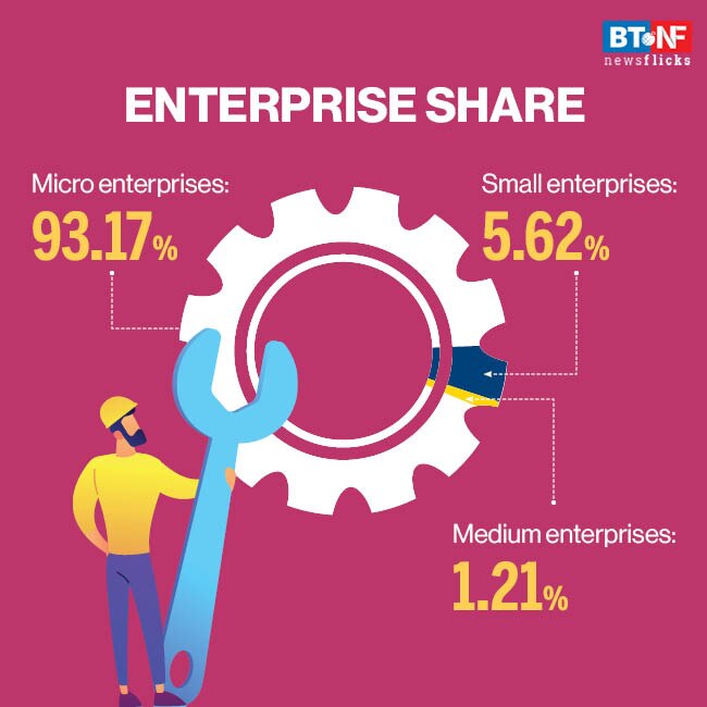 The share of micro enterprises is 93.17 per cent whereas small and medium enterprises have a 5.62 per cent and 1.21 per cent share respectively.