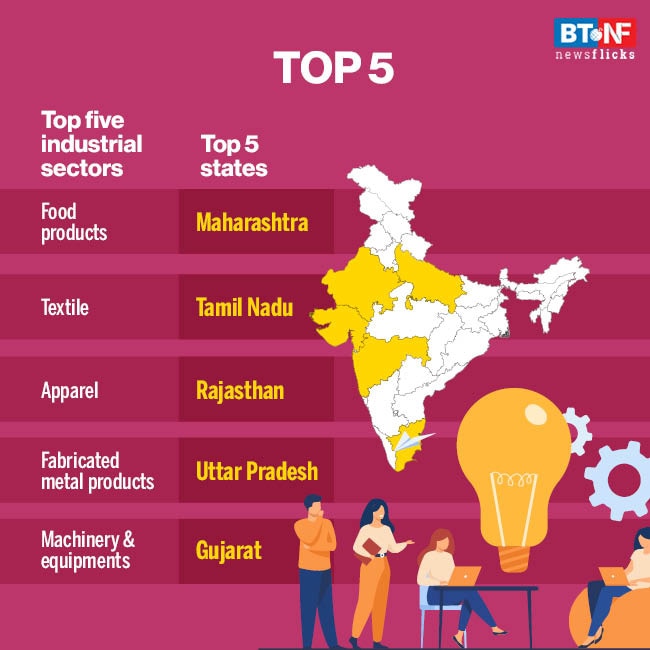 The top five industrial sectors of registrations are - food products, textile, apparel, fabricated metal products and machinery & equipments. The five leading states for Udyam registrations are Maharashtra, Tamil Nadu, Rajasthan, Uttar Pradesh and Gujarat.