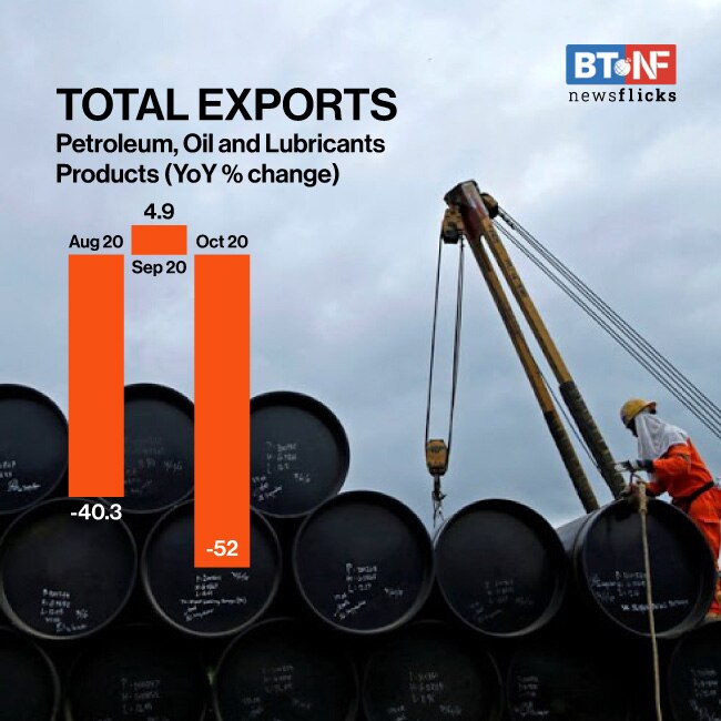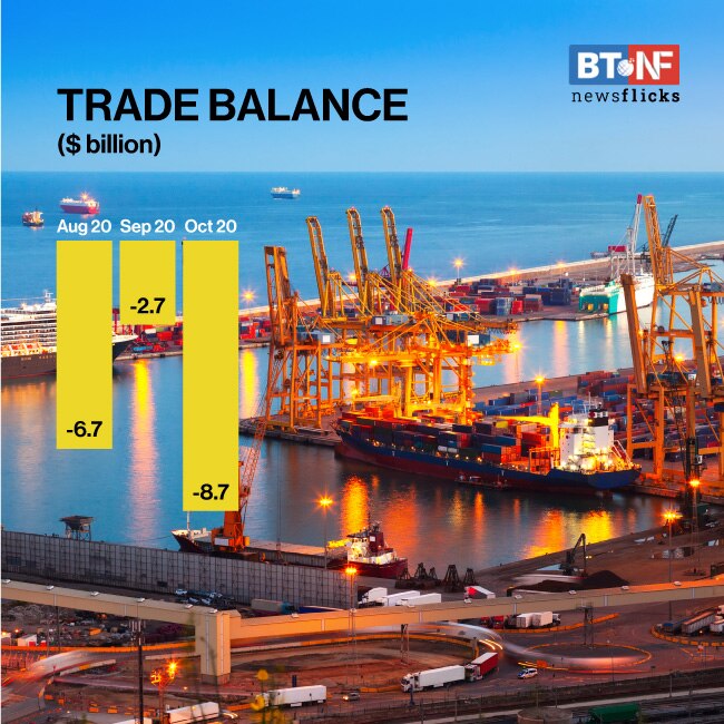 Imports declined for eighth straight month, recording a fall of 11.5 per cent. In October, imports amounted to $33.6 billion, well below the average monthly imports of $40 billion recorded during the pre-lockdown period.
