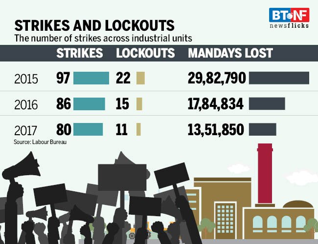 All industrial conflict, including strikes, arises due to discontent and frustration among workers. In India, strikes, lockouts and the resultant loss have seen a dip in the last few years, which has come as a boost for the country's investment climate and ranking in the World Bank's ease of doing business index.