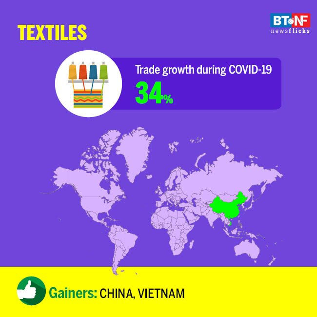 The world trade in textiles shot up by a massive 34% amid the pandemic. During the year the sudden need for PPE (personal protective equipment) increased the demand for textile products such as masks and overall covers. China and Vietnam were the countries that gained market share in textile sector.