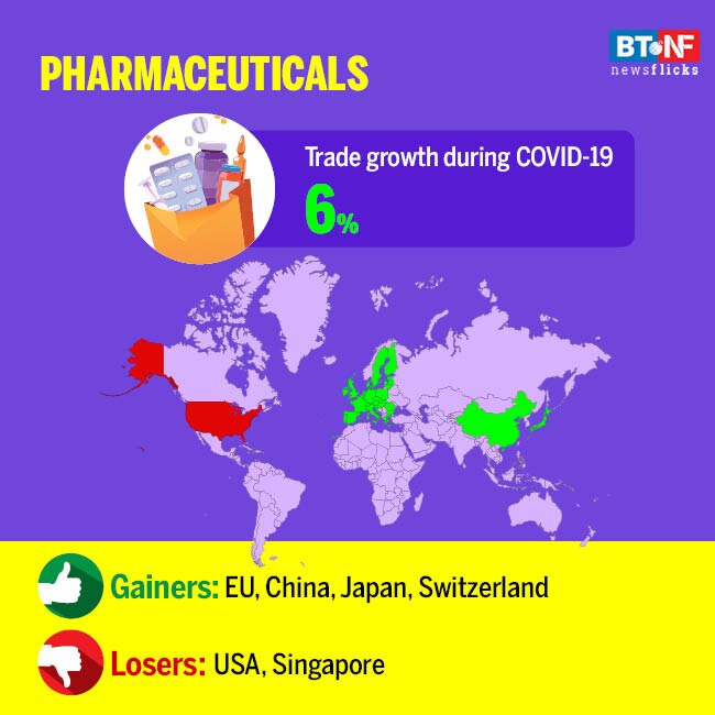 Pharma products saw increased demand during the pandemic. Countries that witnessed a surge in trade of pharma products were China, Japan, Switzerland while US, Singapore lost market share.