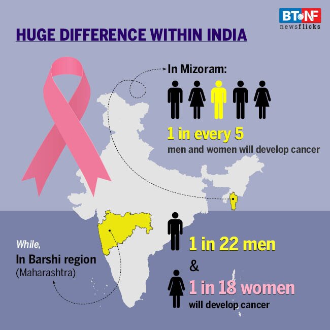 Cancer incidence rates differ noticeably within India. In the north-eastern state of Mizoram, 1 in every 5 men and women will develop cancer during their lifetime, compared with 1 in 22 men and 1 in 18 women in the Barshi region (Maharashtra).