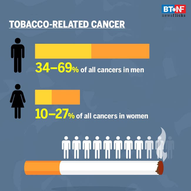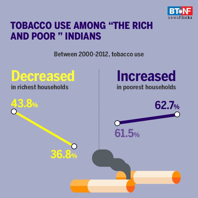 Tobacco-related cancers account for 34-69% of all cancers in men. It constitutes 10-27% of all cancers in women in most regions in India. The report also mentions that between 2000 and 2012, the prevalence of any form of tobacco use decreased in the richest households (from 43.8% to 36.8%) and increased in the poorest households (from 61.5% to 62.7%)