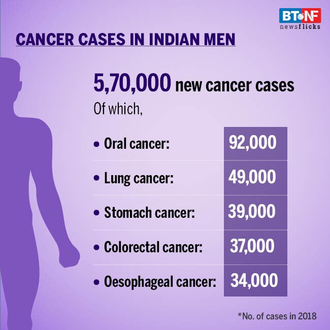 Of the 5,70,000 new cancer cases in men in 2018, oral cancer (92,000), lung cancer (49,000), stomach cancer (39,000), colorectal cancer (37,000), and oesophageal cancer (34,000) account for 45% of the cases.