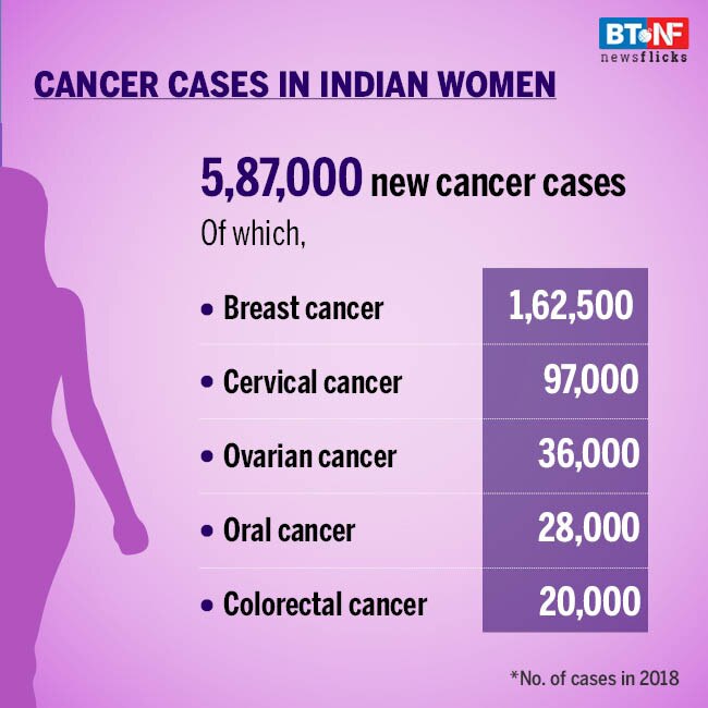 Of the 5,87,000 new cancer cases among Indian women in 2018, breast cancer (1,62,500), cervical cancer (97,000), ovarian cancer (36,000), oral cancer (28,000), and colorectal cancer (20,000) account for 60% of the cases.