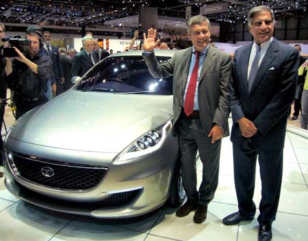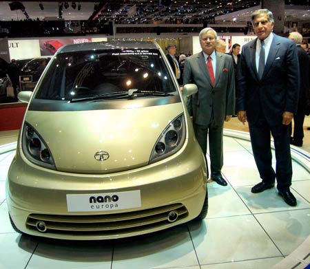 Tata Group chairman Ratan Tata and MD, Tata Motors Ravi Kant stand next to a Nano Europa at the 79th Geneva International Motor Show on Tuesday, March 3, 2009. The Motor Show will open its gates to public from March 5-15, presenting over 1000 brands with more than 85 world and European firsts in the sector saloon alone. Photo: PTI