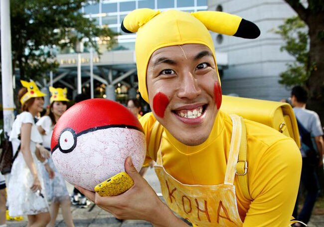 A man wearing Pokemon's character Pikachu costume poses to a camera prior to a parade by performers wearing Pikachu costumes in Yokohama, Japan.