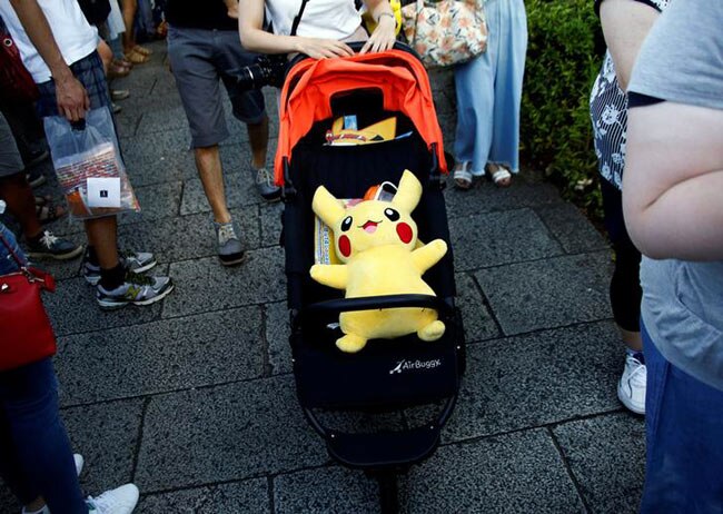 A woman pushes a baby stroller with a Pokemon character Pikachu doll in Yokohama, Japan.