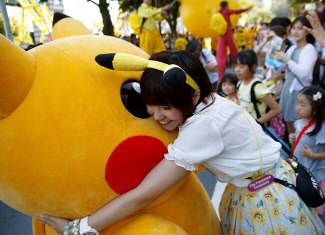 A woman hugs a performer wearing Pokemon's character Pikachu costume during a parade in Yokohama, Japan.