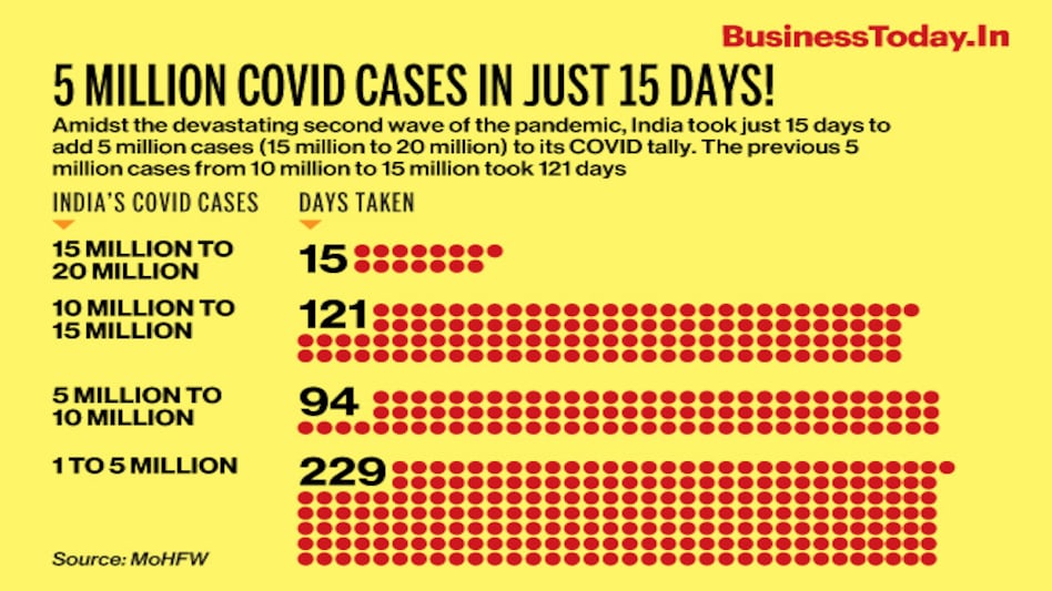 Amidst the devastating second wave of the pandemic, India took just 15 days to add 5 million cases (15 million to 20 million) to its COVID tally