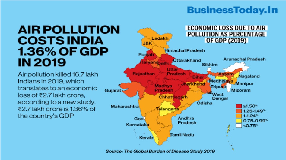 Air pollution killed 16.7 lakh Indians in 2019, which translates to an economic loss of Rs 2.7 lakh crore, according to a new study. Rs 2.7 lakh crore is 1.36% of the country's GDP