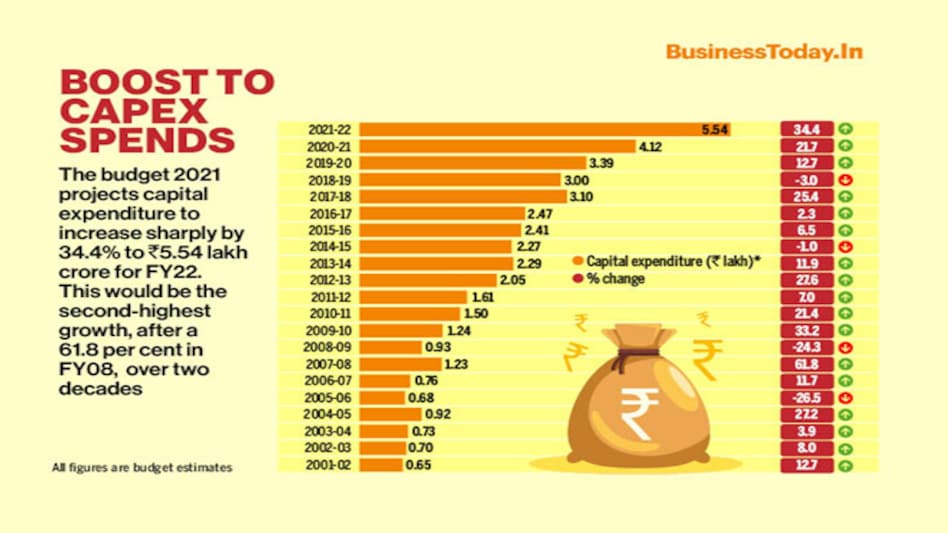 The budget 2021 projects capital expenditure to increase sharply by 34.4% to Rs 5.54 lakh crore for FY22. This would be the second-highest growth, after a 61.8 per cent in FY08, over two decades
