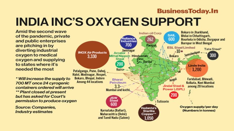 Private and public enterprises are pitching in by diverting industrial oxygen to medical oxygen and supplying to states where it's needed the most