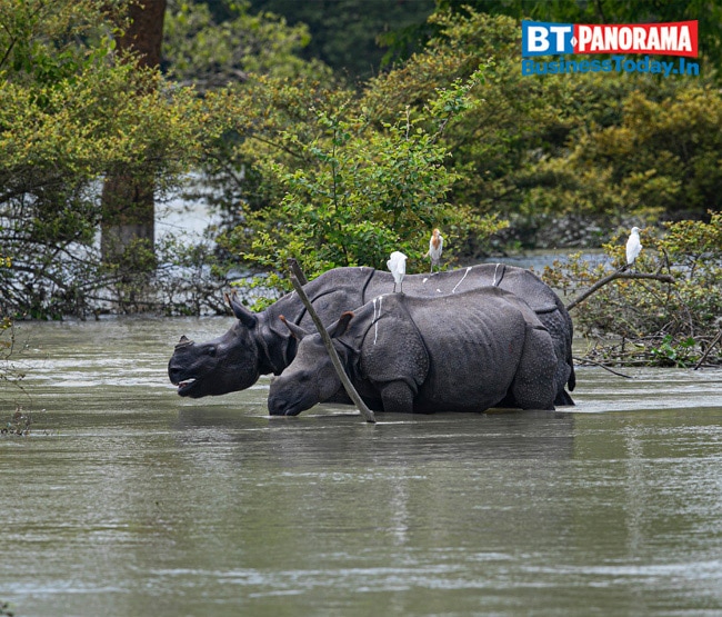 Animals at riskNine rhinos besides 108 wild animals have died during this year's floods at Kaziranga National Park and Tiger Reserve (KNPTR), Assam. The authorities, however, managed to help recover an exhausted rhino who had strayed on to the national highway on July 18, 2020. On the same day, the carcass of a female rhino was found in the central range of the park. She died of drowning. Nearly 85 per cent area of the park, which is spread over 430 sq km, is filled with water at this time. A total of 60 animals have died due to drowning- 36 hog deer, eight rhinos, three wild buffalo, one python, seven wild bear, two swamp deer, one Sambar, two porcupines. Another fifteen hog deer died after getting hit by vehicles on national highway 37 close to the park, while trying to escape the flood waters.
