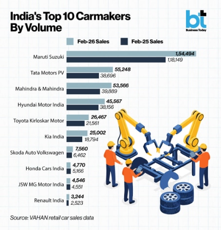 South Korean carmaker Hyundai Motor India, which had long been the second-biggest carmaker by volumes, has been relegated to the fourth position. Hyundai’s sales rose 14% year-on-year to 45,567 units in February, as per VAHAN numbers.
