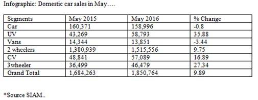 The entire growth in passenger vehicle industry is being driven by high double digit increase in SUV sales. Riding on new launches and the expanding segment of compact utility vehicles, the segment grew 36 per cent in May and lifted the overall sales of passenger vehicle to 6.25 per cent in May 2016 over the same period last year.